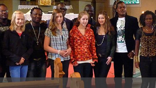 Die Festpredigt hielt der Spiritual der Clemensschwestern Gerhard Theben. Die Feier wurde sehr lebendig mit gestaltet von der Musikgruppe: “Freres de Sang” aus Benin in Afrika. Solch ein Rhythmus in einer kleinen Dorfkirche! – Er wurde mit großer Freude von der Gemeinde aufgenommen – Der Bruder von Pastor van Briel ist als Entwicklungshelfer in Benin tätig und hat für die Musikgruppe eine Tournee durch Deutschland organisiert – und sie begann bei Schwester Euthymia.