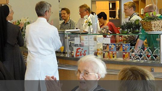 Herr Lascok, Schwester Ingeburga und Chefarzt Dr. Haupts (von li n. re) und das freundliche Küchenteam hatten ins Bistro des Augusta-Hospitals in Anholt eingeladen – nicht nur die Clemensschwestern aus dem Haus, sondern vom gesamten Niederrhein und vom Maria-Ludwig-Stift in Dülmen.