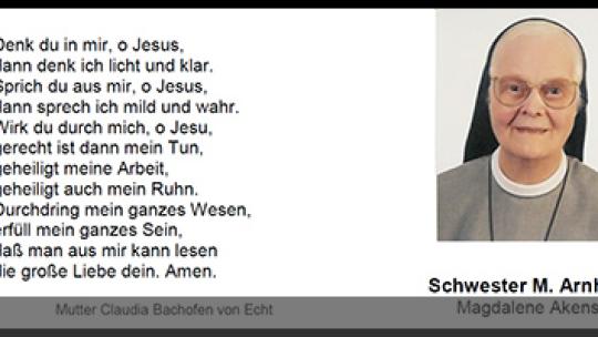 Gott, unser barmherziger Vater, nahm am Abend des 31. Juli 2014 unsere liebe Schwester M. Arnhild, Magdalene Akens, Generaloberin der Clemensschwestern 1974 – 1988 zu sich auf in sein Reich des Lichtes und des Friedens.
