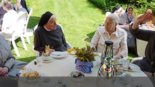 Bei bestem Wetter konnten wir, von Sonnenschirmen behütet, eine festliche Grillpartie, schöne Blumenarrangements und lockere Begegnungen und Austausch mit den Mitschwestern genießen. Am Nachmittag, bei Kaffee und Kuchen waren auch viele Schwestern des Altenkonventes aus Anholt dabei.
