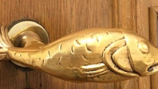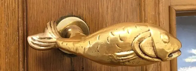 Alle Türen unserer Mutterhauskirche sind seit dem Wiederaufbau um 1958 mit diesen Türgriffen versehen. Es ist diesen „Fischen“ anzusehen, dass sie durch „viele Hände gegangen sind“. Das griechische Wort Ichthys bedeutet Fisch, war in der Urkirche die kürzeste Formel des Glaubensbekenntnisses und ebenfalls ein geheimes Erkennungszeichen für die junge Kirche in der Verfolgung. Alle Anrainerstaaten des Mittelmeeres verstanden diese Sprache.