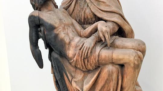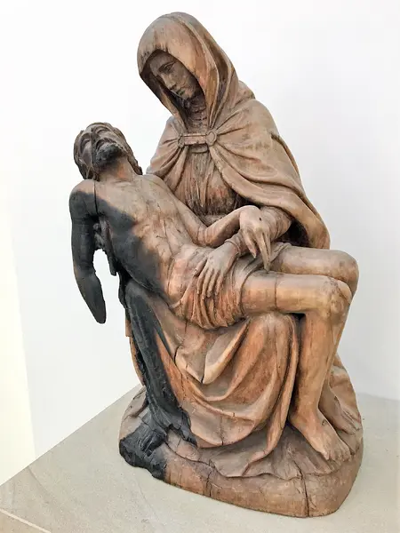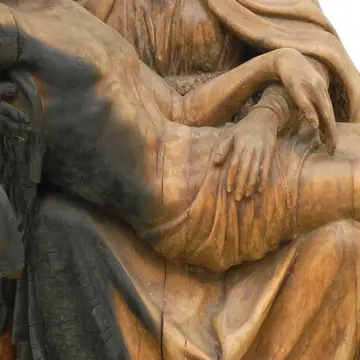 Maria trägt ihren toten Sohn, nach der Abnahme vom Kreuz, auf ihrem Schoß. Von dort wird sein Leichnam der Erde übergeben. So nah wie hier dargestellt, war sie ihrem Sohn bei seiner Geburt. – „Schoß – in Schoß!“