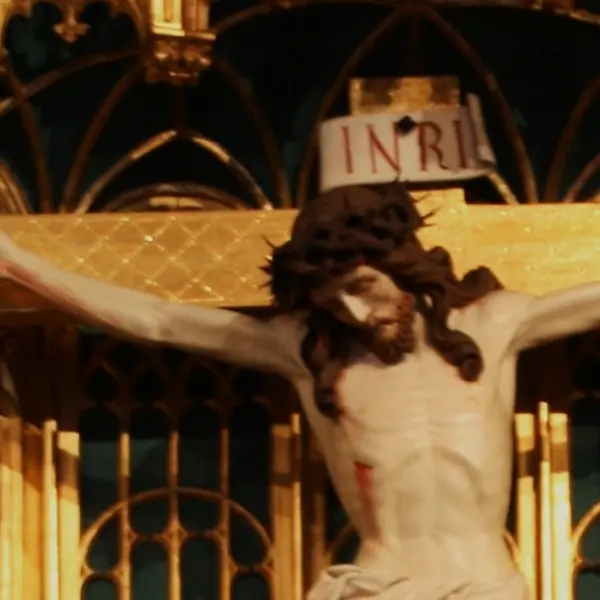 Am Fuß des Kreuzes kniet Maria Magdalena. Sie umarmt den Kreuzesstamm mit großer Inbrunst. Dieses Bild zeigt uns ihre große Liebe und Hingabe zu ihrem geliebten Meister. Vor einigen Tagen noch hat sie seine Füße mit ihren Tränen gewaschen und mit ihren Haaren getrocknet (Vgl, Lk 7,38). Heute sind diese Füße und seine Hände festgenagelt am Holz des Kreuzes. In ihrem Schmerz führt Maria von Magdala alle zusammen, die in Welt und Zeit hier stehen, die aushalten, leiden, weinen, staunen. Auch uns, hier und heute, mit unserem starken oder schwachen Glauben, mit unserer Sehnsucht und unserer Trauer, unserem – wie auch immer – gelebten Leben. Maria von Magdala scheint den Schmerz der ganzen Welt auszudrücken und lädt ein, dass wir uns diesem Mann am Kreuz anvertrauen.