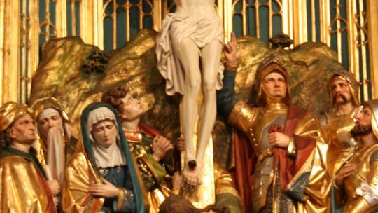 Das Kreuz ist die Mitte des Bildes in diesem Altar; es ist die Mitte der Botschaft Jesu. Seine Worte: „Wenn ich von der Erde erhöht bin, werde ich alle an mich ziehen!“ (Joh. 12,32) schwingen in diesem Bild mit und schallen bis in unsere Zeit hinein. Prominent ragen Gekreuzigter und Kreuz über Golgotha, die Schädelstätte, hinaus, die einem Vulkanausbruch ähnelt. Hier hat Jesus die Welt überwunden. (vgl. Joh. 16,33)