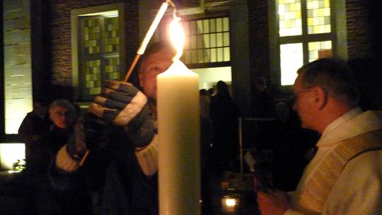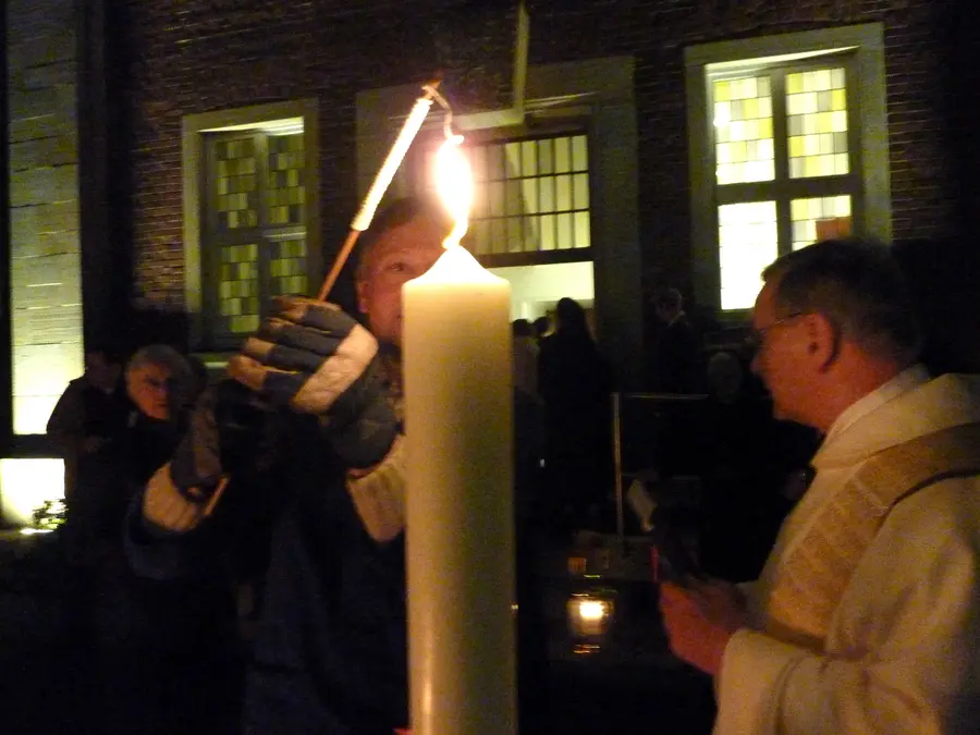 Licht vom Osterfeuer für die gesegnete und von verklärten Wunden gezeichnete Kerze.